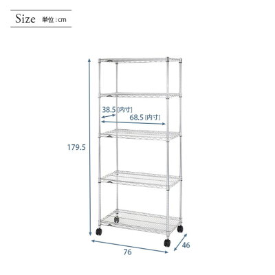 内容明細 棚板(幅76×奥46cm)×5枚スリーブ×20組ポール(約174cm)×4本キャスター×4個(内2個はストッパー付)アジャスター×4個 材質 本体:スチール(クロームメッキ)※クリアコーティング(防サビ加工)スリーブ:ABS樹脂キャスター:ナイロン樹脂 その他 こちらの商品はルミナス25mmホームラック「LH7618-5」の後継機となります。