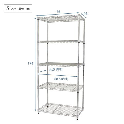 標準アジャスターの場合(約)-4.5cm 耐荷重 棚板(1枚あたり):80kg全体/アジャスター装着時:400kgキャスター装着時:300kgキャスター走行時:50kg 重量 14.5kg 内容明細 棚板(幅76×奥46cm)×5枚スリーブ×20組ポール(約174cm)×4本アジャスター×4個キャスター×4個(内2個はストッパー付) 材質 本体:スチール(クロームメッキ)※クリアコーティング(防サビ加工)スリーブ:ABS樹脂アジャスター:ABS樹脂キャスター:ナイロン樹脂 その他 ルミナスのロゴは付きませんが性能はほとんど変わりません。